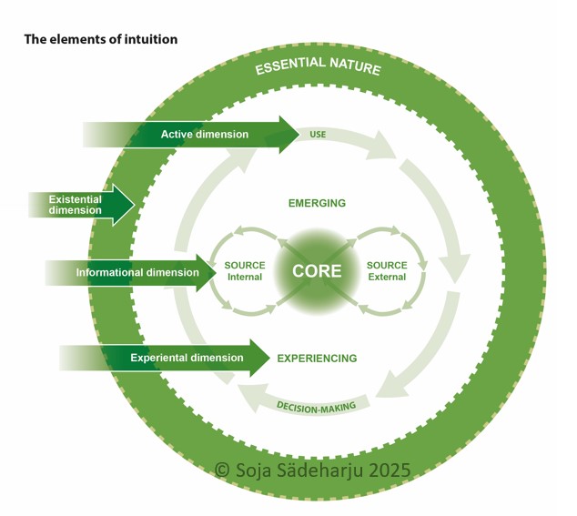 Verbaalinen ja kuvallinen 2D-muodossa tehty ilmaisu typistää ja latistaa väistämättä sitä moniuloitteista kokonaisuutta, joka intuitio päätöksenteossa on. Viereinen kuva elementeistä ja ulottuvuuksista on yksi askel eteenpäin yrityksessä konkretisoida ilmiötä.